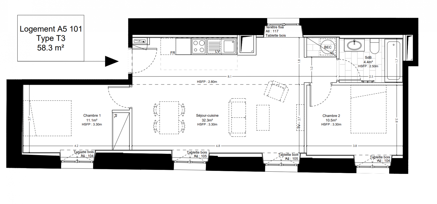 | Voir | Disponible | 484 400€ | A3.101 | Appt. | T3 | 65.3m2 | 1er | Disponible | 484 400€ Prix foncier 44 100€ Prix travaux 424 300€ | Voir |