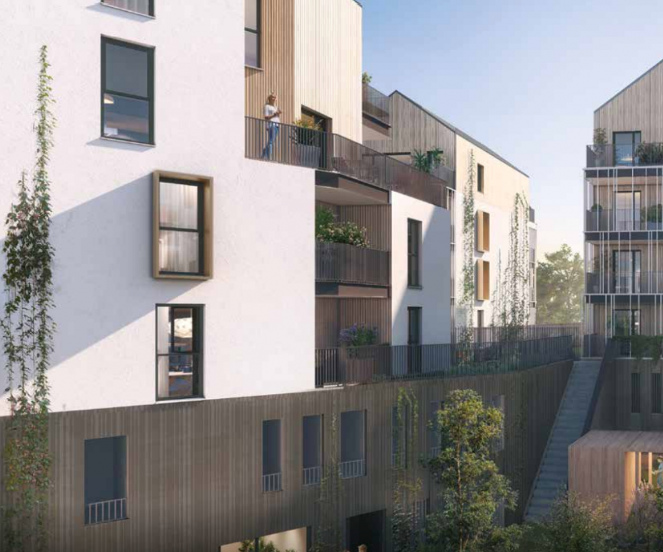 La résidence « LE TIVOLI » innove et opte pour une ossature porteuse et des charpentes entièrement en bois pour les maisons sur le toit. Le choix du bois permet de bâtir un lieu de vie plus sain, vertueux en carbone tout en réduisant les nuisances de chantier et il s’agit de plus d’un matériau renouvelable. Avec ses sentes aux plantes luxuriantes, son cœur d’îlot, son espace de culture partagée, ses trames vertes verticales et ses réservoirs de biodiversité, « LE TIVOLI » s’inscrit en harmonie avec les espaces publics des Frais Lieux et la Promenade des Pommiers. L’espace jardin partagé, animé par les résidents est un lieu de convivialité au service de la biodiversité. On y retrouve des bacs à potager partagés, une palette végétale sur le thème “ cueillir et manger ”. Cet espace de partage permet aux résidents et à leurs enfants de se sensibiliser au végétal à travers des moments de pédagogie et de détente. L’ambition architecturale du « Tivoli » est simple : incarner de façon contemporaine les nouvelles façons de vivre en contact avec la nature. L’îlot central, ouvert, crée de nombreuses continuités paysagères, véritables percées visuelles et végétales. La composition de la résidence privilégie des logements traversants et/ou à double orientation. Architecturalement, le jeu des matières, la verticalité des motifs, des brise-soleil et des garde-corps créent un dialogue avec la nature des espaces végétalisés. Tous les logements présentent de beaux volumes et bénéficient de prestations de qualité. Les derniers niveaux, comme posés ou suspendus sur les bâtiments dans un jeu d’attique, sont constitués de « maisons sur le toit » en habillage bois. Ces « maisons » bénéficient de grandes terrasses privatives qui permettent d’admirer la vue alentour. Deux d’entre elles profitent d’un espace végétalisé avec pelouse et jardinières. Enfin, les toitures des bâtiments sont engazonnées. Ces « prairies » urbaines sont de véritables refuges de biodiversité sauvage et spontanée. Ils représentent des écosystèmes accueillants en milieu urbain et donnent une nouvelle dimension à l’architecture contemporaine.