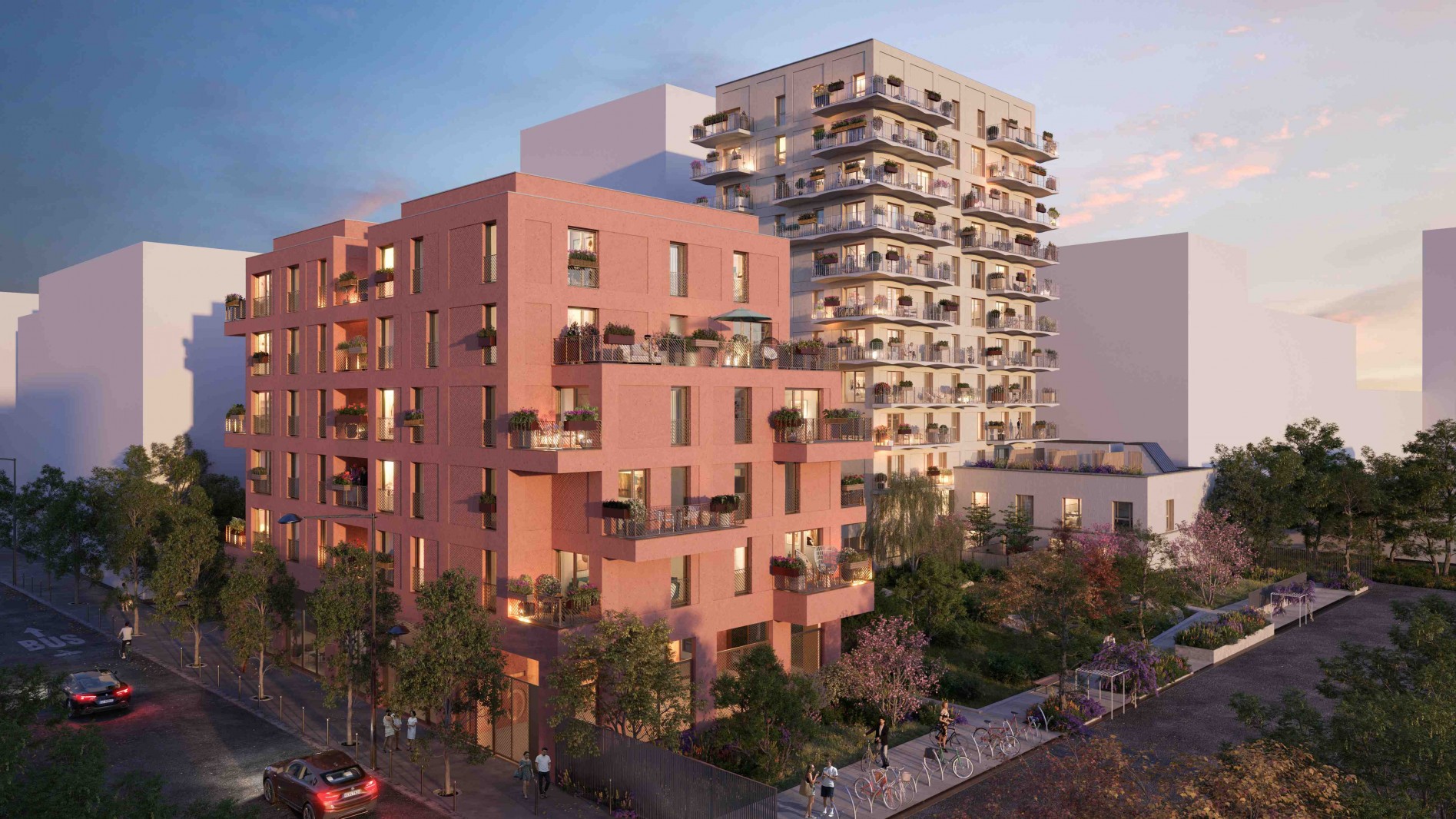 En cœur d’ilot, un jardin paysager et en sous-sol, des places de stationnement pour la plupart des logements, sécurisées et équipées de bornes de recharge pour véhicules électriques.