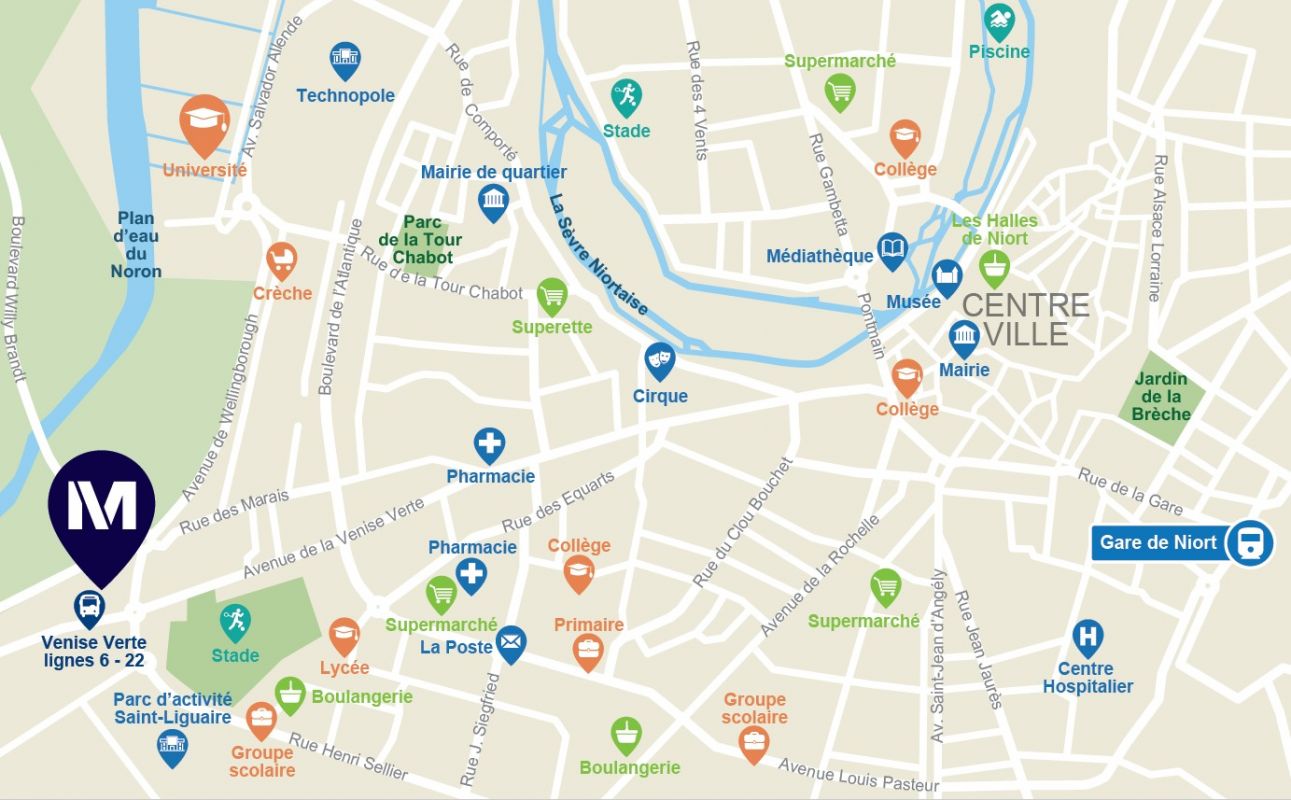 Situation : A 10min à vélo/bus du centre-ville de Niort ; Ecoles supérieures : UCO à 6min à vélo et le pôle universitaire à 25 min en bus ; Commerces et services dans un rayon de 10min à pi...