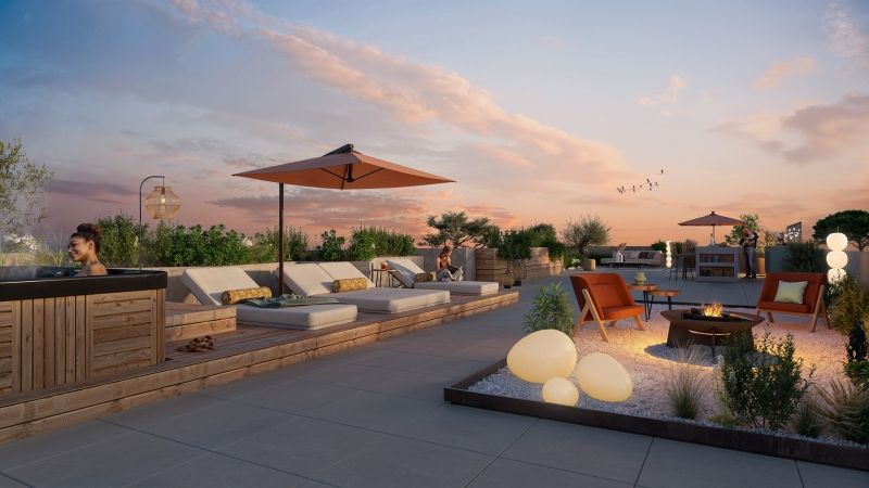 Le coeur d'îlot paysager, signé par les paysagistes COLOCO, dévoile un jardin secret où la végétation méditerranéenne reprend ses droits : pins parasols, lavandes, oliviers et rochers sculptés y dessinent un théâtre naturel vivant au fil des saisons.